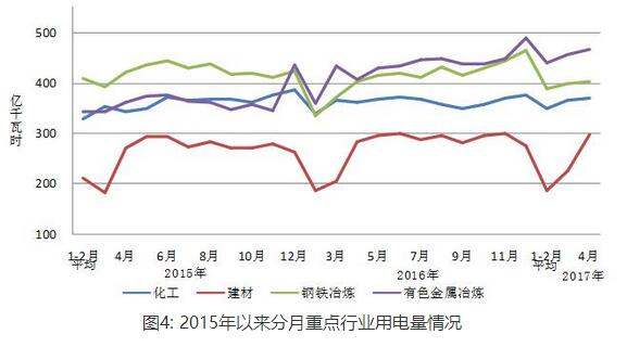 三、有色用电量保持较快增长,钢铁用电量同比增速较上月回落 1-4月份,化学原料制品、非金属矿物制品、黑色金属冶炼和有色金属冶炼四大高载能行业用电量合计5703亿千瓦时,同比增长8.3%,增速比上年同期提高12.8个百分点;合计用电量占全社会用电量的比重为29.5%,对全社会用电量增长的贡献率为36.3%。其中,化工行业用电量1431亿千瓦时,同比增长3.8%,增速与上年同期基本持平;建材行业用电量898亿千瓦时,同比增长4.3%,增速比上年同期提高6.5个百分点;黑色金属冶炼行业用电量1573亿千瓦时,同比增长7.5%,增速比上年同期提高19.1个百分点;有色金属冶炼行业1802亿千瓦时,同比增长15.4%,增速比上年同期提高20.7个百分点。 4月份,四大高载能行业用电量合计1535亿千瓦时,同比增长5.8%,增速比上年同期提高6.2个百分点,占全社会用电量的比重为31.7%。其中,化工行业用电量369亿千瓦时,同比增长3.9%,增速比上年同期回落1.9个百分点;建材行业用电量297亿千瓦时,同比增长5.1%,增速比上年同期提高0.7个百分点;黑色金属行业用电量403亿千瓦时,同比下降0.8%,增速比上年同期提高3.4个百分点;有色金属冶炼行业466亿千瓦时,同比增长14.4%,增速比上年同期提高19.3个百分点。